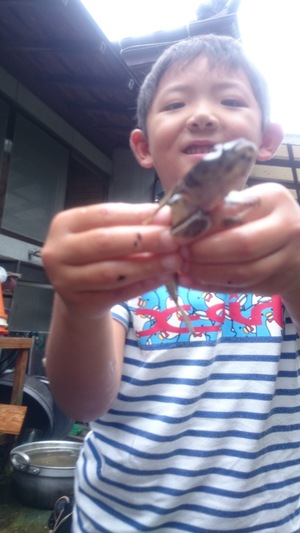 じいちゃんが釣った魚を捕まえて笑ってました