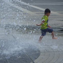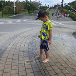 水族館の敷地内にある噴水で水遊び中